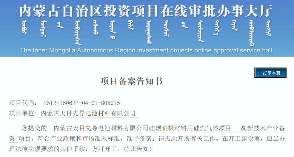 12月30日,内蒙古自治区投资项目在线审批办事大厅发布,内蒙古天目先导电池材料有限公司硅碳负极材料用硅烷气体项目备案审批公示。