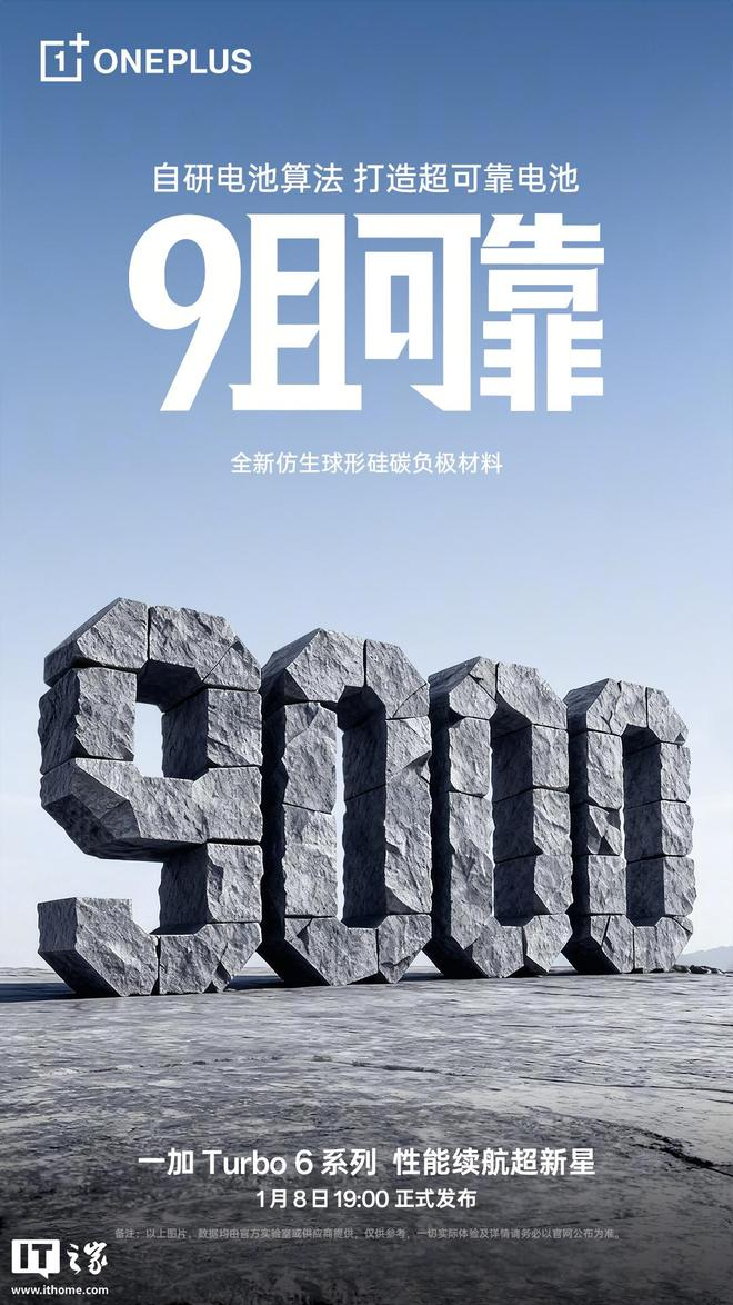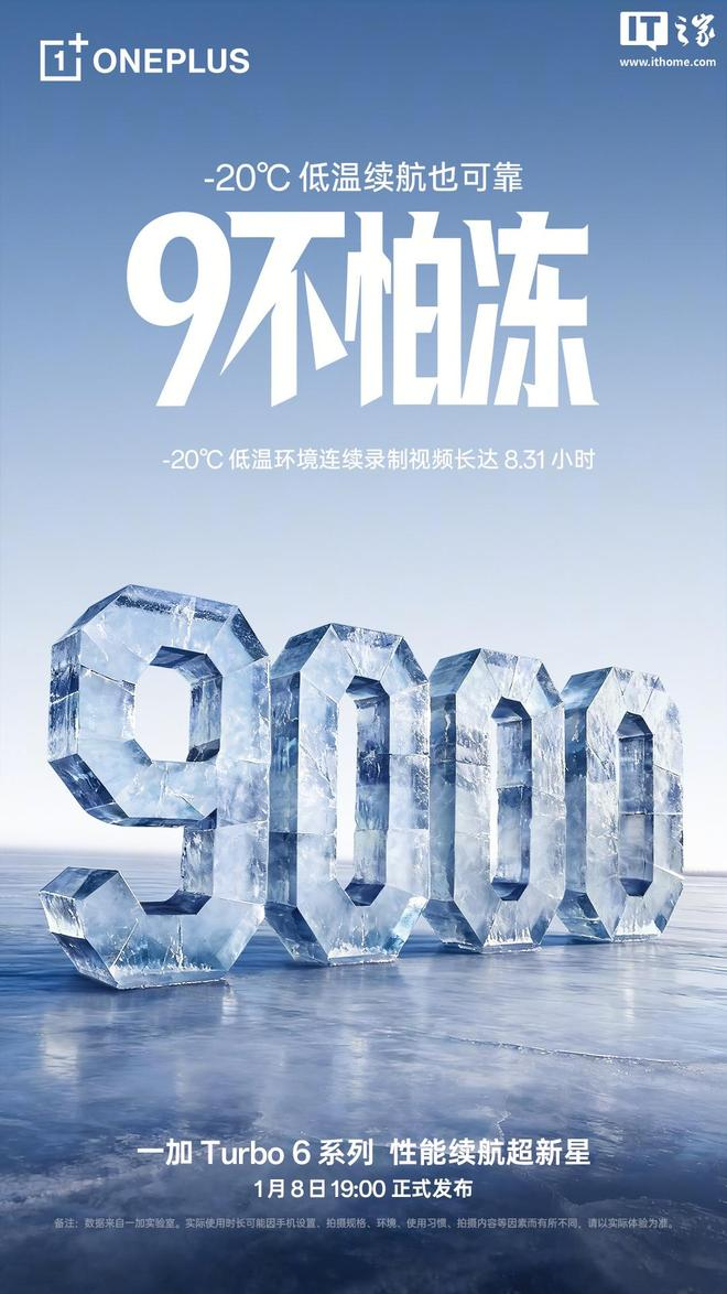 1 月 5 日消息,一加手机官方宣布,一加 Turbo 6 系列新机将配备 9000mAh 大电池,宣称拥有五年耐用电池健康,可在-20℃ 下低温环境正常使用。