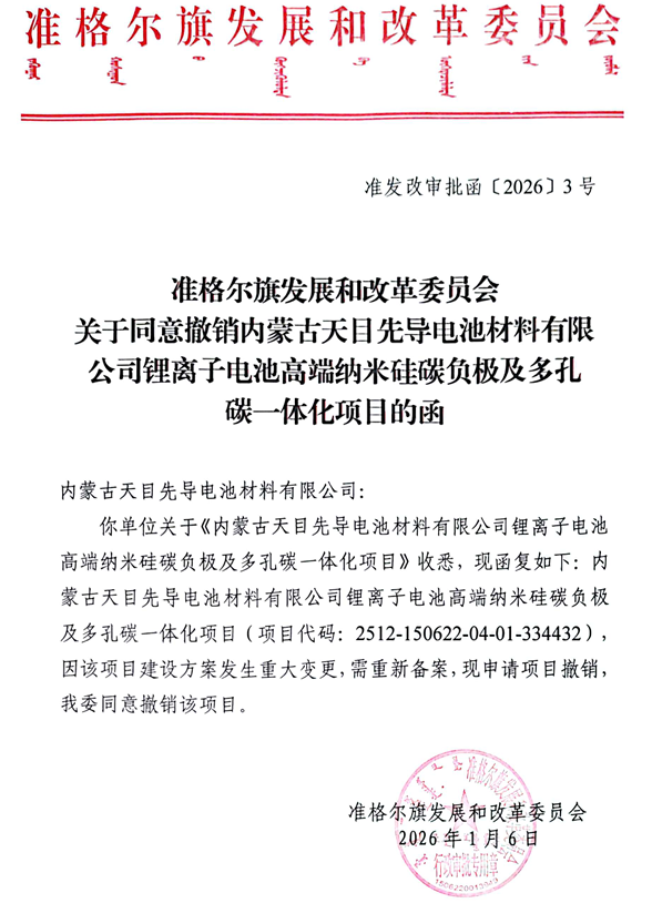 1月6日,内蒙古自治区投资项目在线审批办事大厅发布《关于同意撤销内蒙古天目先导电池材料有限公司锂离子电池高端纳米硅碳负极及多孔碳一体化项目的函》。