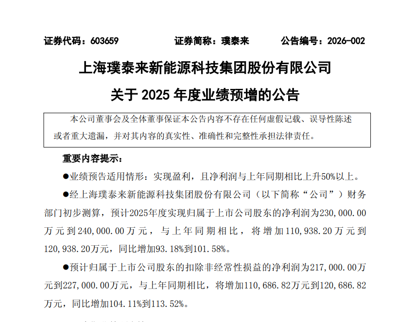 璞泰来(603659)1月20日公告,预计2025年度实现净利润为23亿元到24亿元,同比增加93.18%到101.58%。