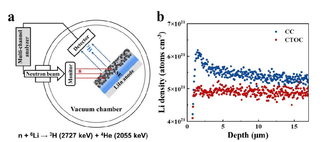 ▲(a)固态电池正极利用中子深度剖面分析技术测量示意图