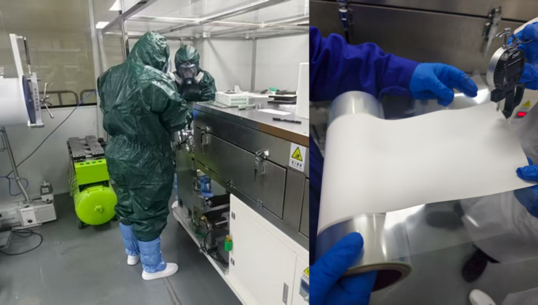 正在进行干房涂布的科研人员和超薄硫化物固态电解质膜。受访者供图