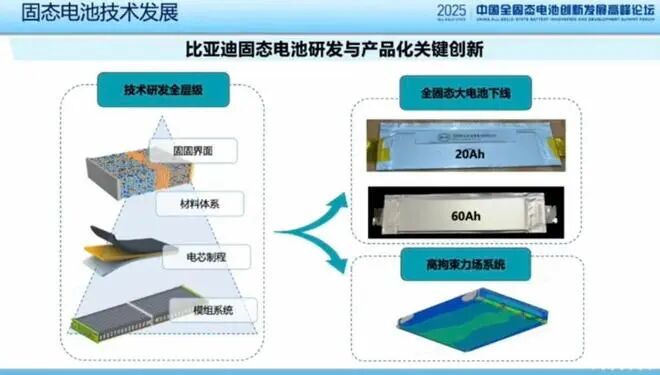 2025年2月,在第二届中国全固态电池创新发展高峰论坛上,深圳市比亚迪锂电池有限公司CTO孙华军表示,2024年比亚迪已经下线(中试)60Ah全固态电池,计划在2027年左右启动全固态电池的批量示范装车应用,并在2030年后实现大规模上车。
